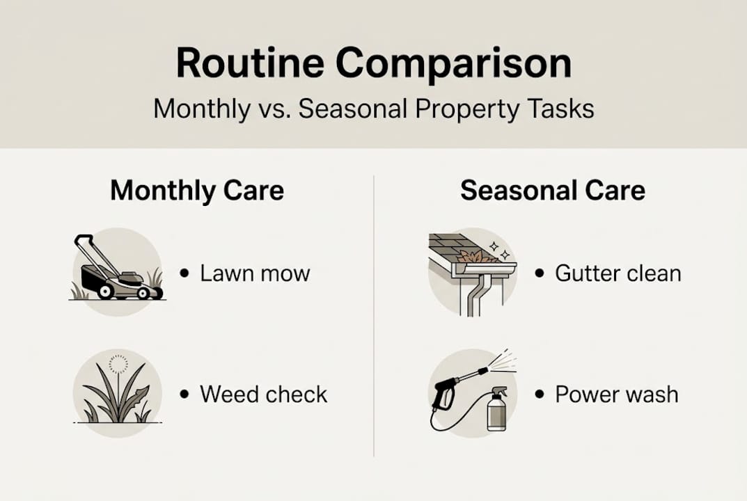Light garden and exterior maintenance should be scheduled at least monthly, with heavier tasks completed each season for the best ongoing curb appeal.