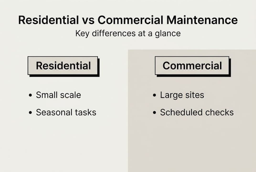 - Residential maintenance focuses on aesthetics, comfort, and flexible scheduling.