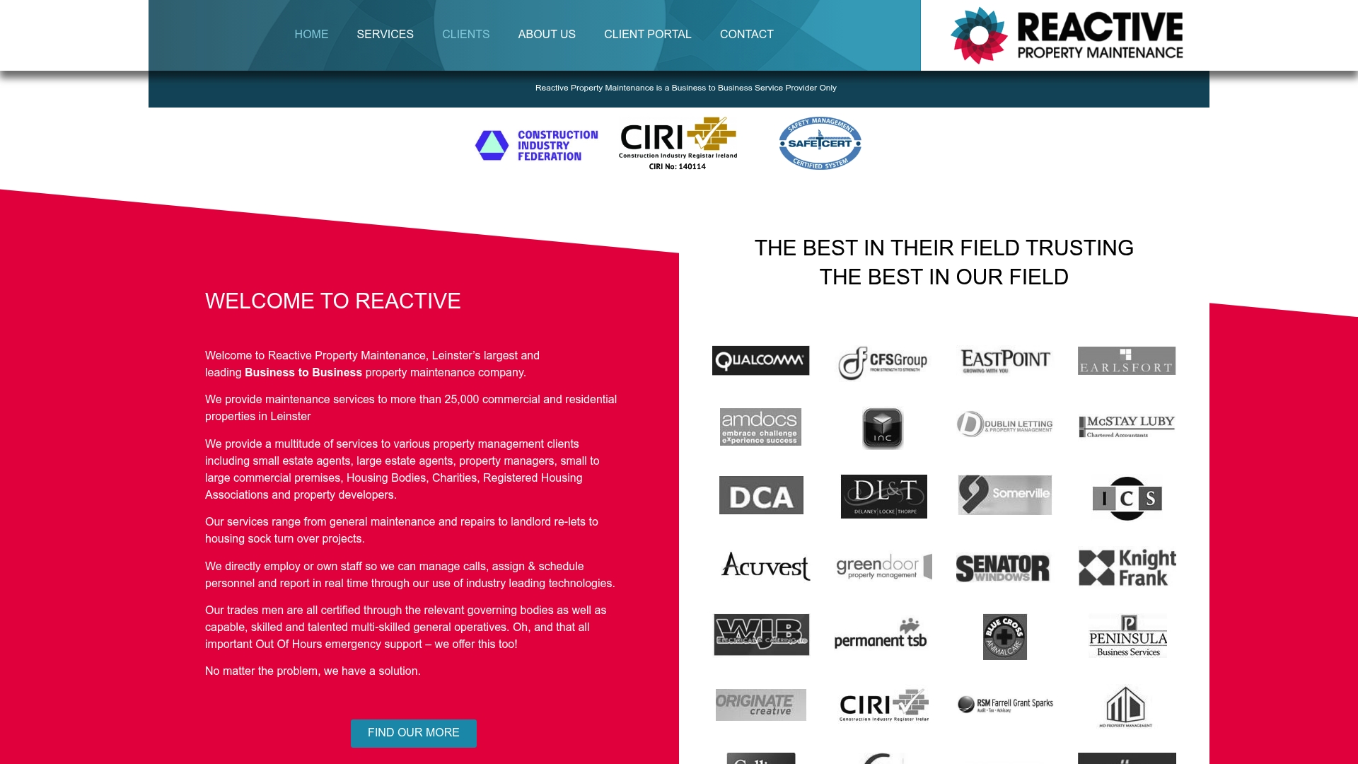 Reactive Property Maintenance is Leinster's largest Business to Business property maintenance provider, serving over 25,000 commercial and residential properties since 2008. The firm combines a wide trades roster with a client portal for transparent reporting and offers out of hours emergency support.