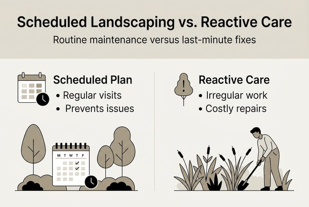 As stated in guidance on outdoor maintenance for property managers, routine landscaping preserves appearance and function, with planned seasonal work built in. Reactive services cannot match this because they are designed to solve a specific problem rather than maintain the whole.